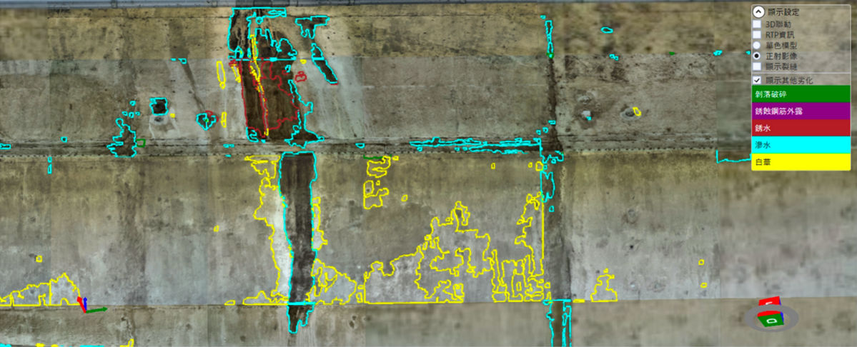 運研所 111~112 年推動辦理「無人機搭配 AI 影像辨識應用於橋梁檢測之研究」兩年期研究計畫,在 111 年已開發混凝土橋梁 AI 影像辨識模式,可針對六大主要構件(主梁、橫隔梁、橋墩/帽梁、橋面板、橋台及擋土牆),自動判識三大類常見劣化缺失(裂縫、混凝土剝落破碎及鋼筋銹蝕、滲水與白華損傷),大幅提升橋梁劣化檢測的準確性。112 年進一步結合無人機技術,運用其機動性與即時性優勢,開發自動化飛行拍攝與 AI 辨識整合流程,提升橋梁檢測之效率與品質。113 年度利用前期 AI 影像辨識模式開發完成智慧橋檢系統,並結合橋梁檢測 3D 影像模型作業程序,能於三維模型中呈現各橋梁構件與劣化位置,協助使用者更精準掌握劣化範圍與程度,有效支援後續維護決策。